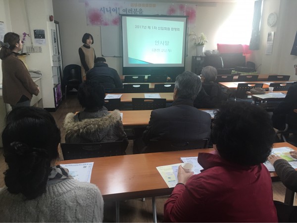 - 내 용: 2017년 3월 10일 제 1차 신입회원환영회를 진행하였습니다. 2016년 12월 20일부터 2017년 2월 28일 까지의 어르신들을 대상으로 12명의 어르신들이 참석하여 복지관사업소개, 이용규칙, 시설소개를 진행하였으며 질의응답 및 건의사항을 이야기 하는 시간을 가졌습니다. 또한 서로의 이름을 알아가는 시간을 가졌습니다.
