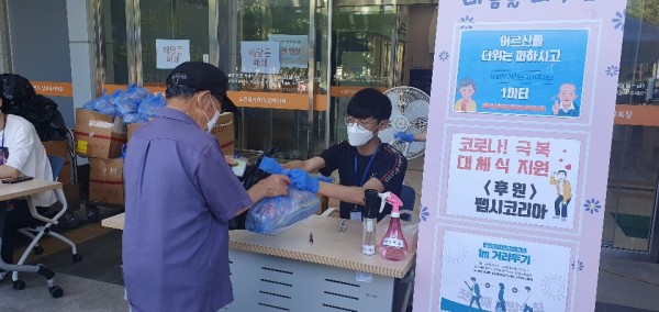 내용: 펩시코리아에서 코로나극복을 위한 무료급식대상자어르신들의 대체식(영양떡)을 지원했습니다.