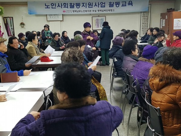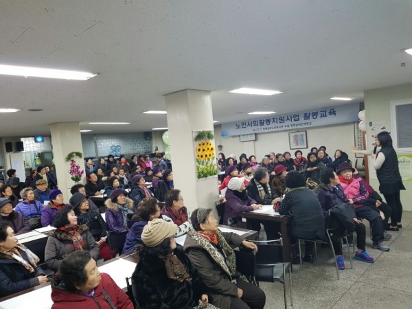- 내용: 2017년 노인사회활동지원사업 전국형 연중 노노케어 합격자 분들의 활동교육(안전교육)이 실시되었습니다. 조편성, 수요처 선정, 안전교육, 활동교육을 실시하였습니다.