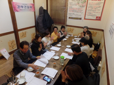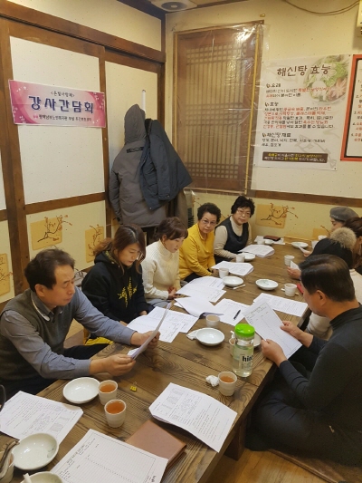 - 내 용: 주간보호센터에서 2016년 하반기 강사간담회를 진행하였습니다. 총 강사님 7명이 참여하신 가운데 2016년 사업평가 및 2017년 사업 에 대한 논의가 있었습니다. 회의 후 강사님과의 친목 도모를 위한 식사가 마련되었습니다.
