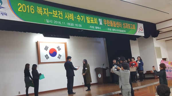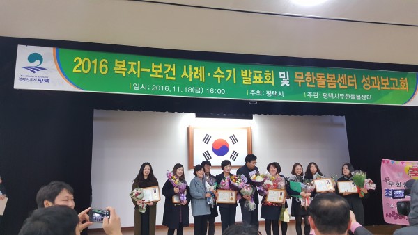 - 내용: 11월 18일날 평택시청 대강당에서 진행된 2016년 복지-보건 사례, 수기 발표회 및 무한돌봄센터 성과보고회에 참석하여 지역복지담당 백소영 사회복지사가 사례,수기 장려상을 수상하였습니다.