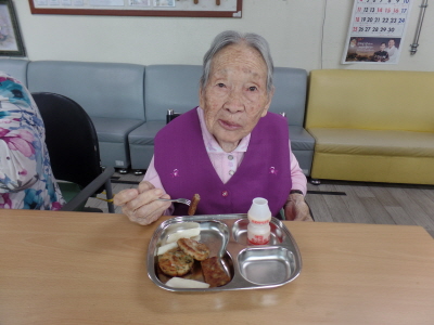 전은 뜨거울 때 먹어야 맛있다 하시며 주간보호 어르신들 모두 전을 맛있게 드셨습니다.
