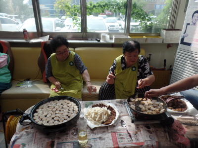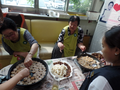 왕년에 솜씨를 발휘하시는 빠른 손놀림. 손은 많이가지만 신나고 즐거운 마음으로 전을 뚝딱 부쳐가시는 어르신들..