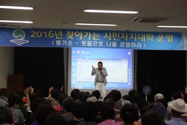 - 내용: 복지관에서는 이용 어르신 200명을 모시고 개그맨 황기순 초청의 웃음으로 나를 경영하라라는 주제로 찾아가는 시민자치대학을 진행하였습니다. 무더운 중복에도 불구하고 유쾌하고 즐거운 강의를 해주신 강사님과 참여 어르신들에게 감사드립니다.