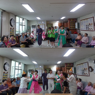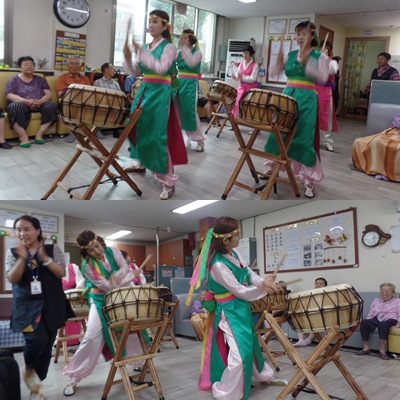 - 인 원: 어르신 17명, 센터관장님, 주간보호 직원 4명, 노래교실 공연단 4명(백성숙 강사 외3명), 신한고등학교(에넥도트 동아리) 난타 공연단 5명(방그리난타공연팀)