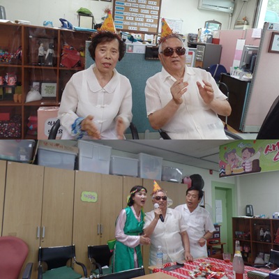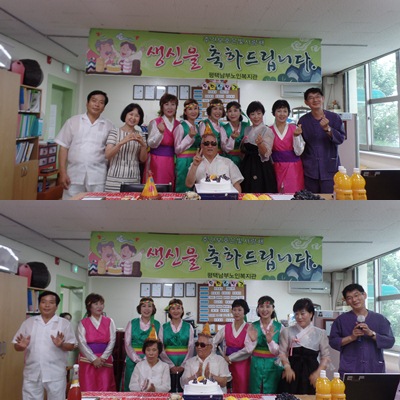 기념촬영을 하며 생신 축하 노래, 케잌 커팅, 선물 전달식 그리고 멋진 공연 등으로 한 여름 무더위를 날려보내며 즐거운 시간의 막을 내립니다.