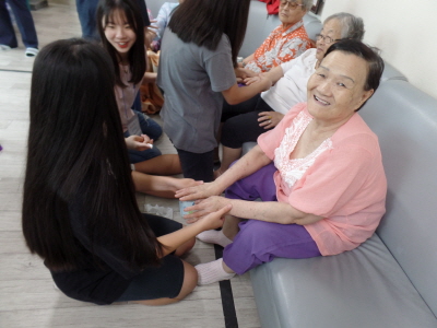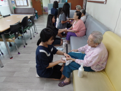 여학생들의 재잘거림에 마냥 좋으신지 어르신들은 미소와 환한 웃음을 보이셨으며 여린 손으로 시원하게 손 마사지를 해주니 좋다.. 오래간만에 손주들이 생각나서 눈물이 나도록 좋다.. 앞으로 우리 손녀딸 하자 등의 말씀들을 하셨으며 짧은 시간 따뜻하고 즐거운 시간을 보내셨답니다.