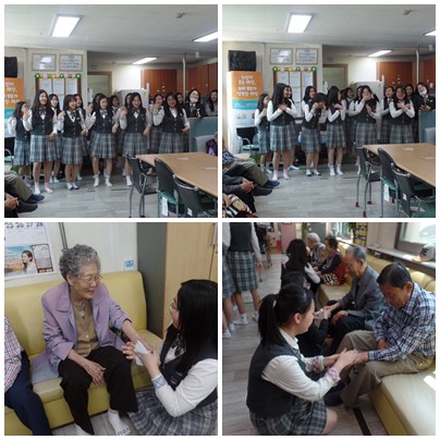 예쁜 여학생들이 어르신들 앞에서 재롱이 깃든 멋진 율동과 노래를 부르며 즐거운 시간을 보냈답니다.
