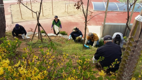 화단 잡초 제거 작업을 하고 계셨습니다.
