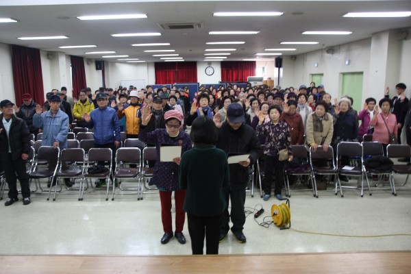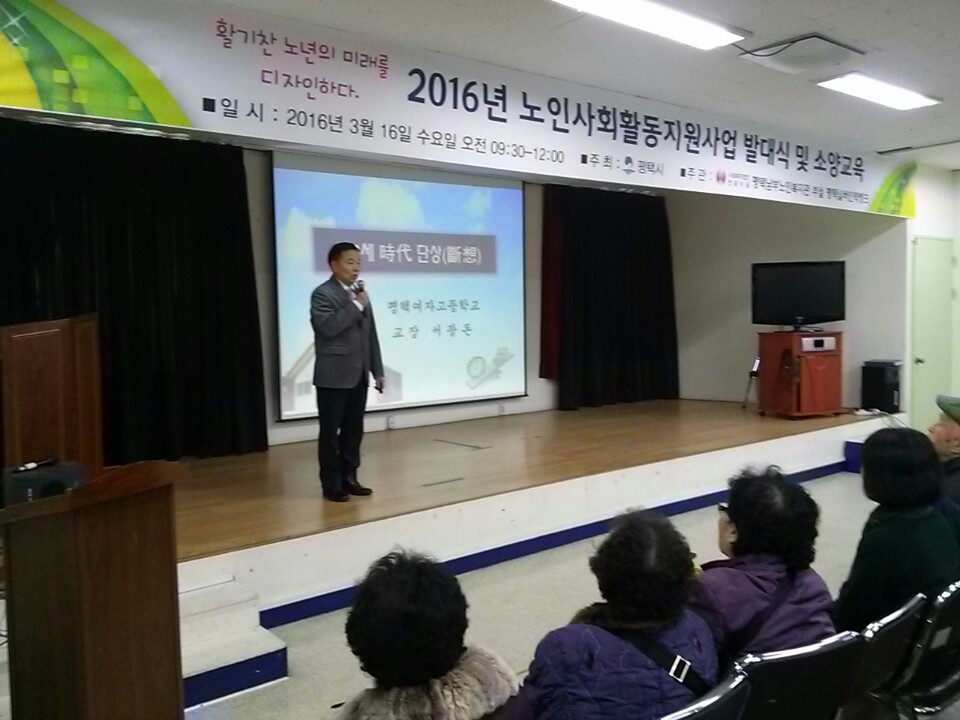 내용: 2016년 노인사회활동지원사업 참여자들이 한자리에 모여 발대식을 진행하였습니다. 순서는 활동선서, 활동 소개, 안내사항 및 안전교육(1시간), 활동교육(1시간) 으로 이루어 졌습니다.