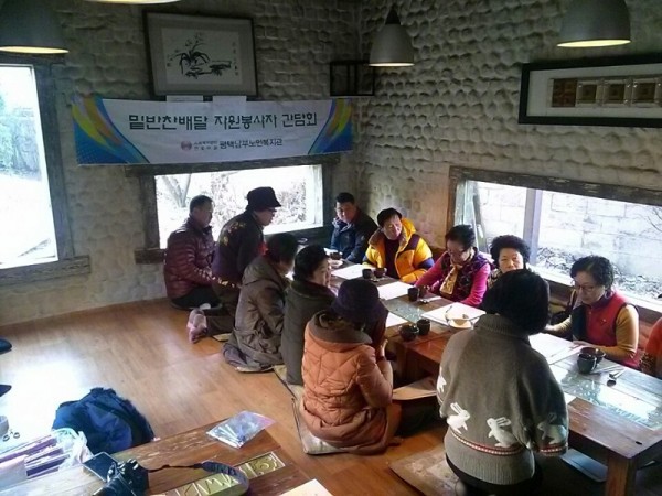 *내 용 : 2015년산해진미서비스(저소득 요보호 결식우려 어르신 밑반찬 제공) 배달 봉사자 11명과 함께 사업점검 및 사례관리를 위한 간담회가 진행되었습니다. 궂은 날씨에도 불구하고 항상 도시락배달을 위해 힘써주신 어르신 봉사자님들께 감사드립니다.