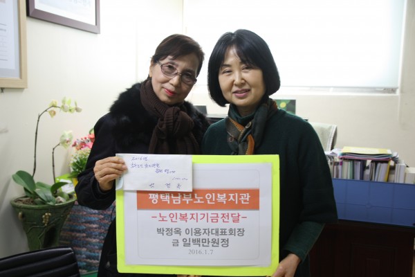 (후원) 평택남부노인복지관 박정옥이용자대표회장 기부금 전달 페이지 정보 작성자 평노 작성일16-01-08 13:34 조회1,428회 댓글0건 관련링크 이전글 다음글 목록 본문 일시: 2016년 1월7일(목) 12시장소: 관장실내용: 노인복지기금 전달식 - 박정옥 이용자대표회장 - (금일백만원정)-2016년의 새로운 도약을 위한 밑거름이 되겠습니다.- 많은 관심과 지원 감사드립니다. 댓글목록 등록된 댓글이 없습니다. 이전글 다음글 목록