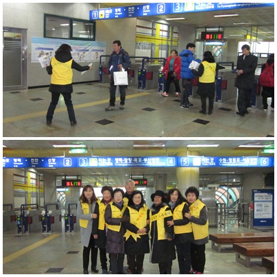 2015년 12월 2일 오전 10시부터 오후1시까지 서정리역에서 일반시민 및 어르신들을 대상으로 노인자살예방홍보캠페인을 실시하였습니다. 이번 행사에는 노인사회활동지원사업 참여자로 활동하고 계시는 생명사랑교육단 어르신들도 함께 하였습니다. 비가 오는 가운데에서도 열심히 귀기울여주신 시민분들과 생명사랑교육단 어르신들께 감사드립니다. 앞으로 노인상담을 통해서 더욱 더 많은 어르신들이 절망에서 희망으로 변화되기를 기원합니다.