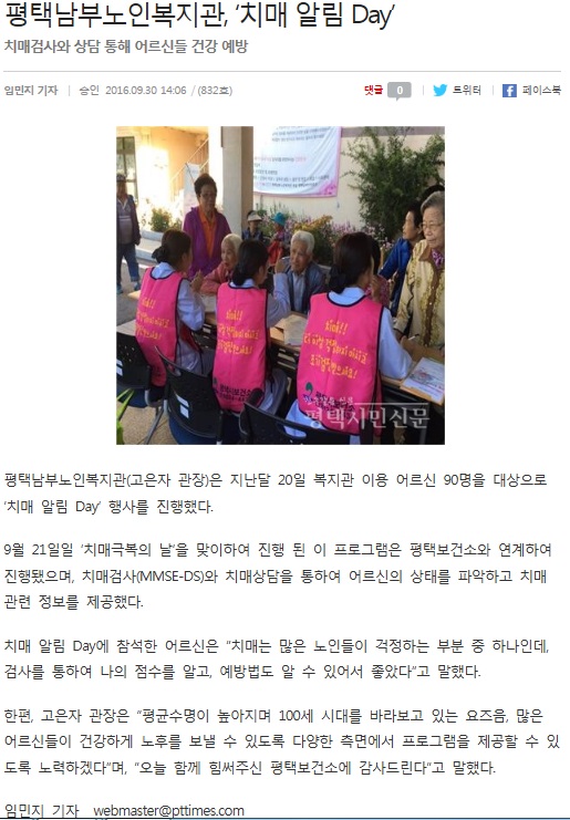 2016년 9월 20일 - '치매 알림 Day' (평택시민신문) 페이지 정보 작성일16-10-05 10:30 조회3,716회 댓글0건 관련링크 이전글 다음글 목록 본문 보다 자세한 내용은 아래의 주소를 참고하여 주시기 바랍니다.http://www.pttimes.com/news/articleView.html?idxno=39882 댓글목록 등록된 댓글이 없습니다. 이전글 다음글 목록
