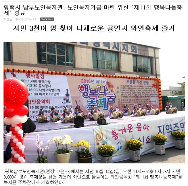 2016년 10월 19일 (수) - 제 11회행복나눔축제 보도자료 (평택자치신문) 페이지 정보 작성일16-10-19 15:59 조회3,886회 댓글0건 관련링크 이전글 다음글 목록 본문 자세한 기사내용은 아래 링크를 확인하세요http://www.ptlnews.kr/bbs/board.php?bo_table=news02&wr_id=103011 댓글목록 등록된 댓글이 없습니다. 이전글 다음글 목록