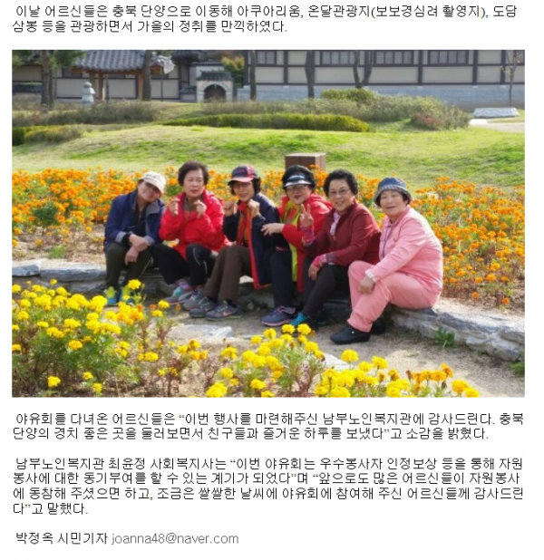 2016년 11월 2일 - (실뱅)어르신 자원봉사자 야유회(평택자치신문) 페이지 정보 작성일16-11-02 11:17 조회4,225회 댓글0건 관련링크 이전글 다음글 목록 본문 자세한 기사내용은 아래링크를 확인하세요.http://www.ptlnews.kr/bbs/board.php?bo_table=zone&wr_id=102260 댓글목록 등록된 댓글이 없습니다. 이전글 다음글 목록