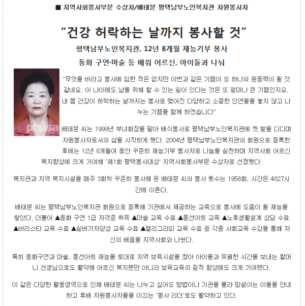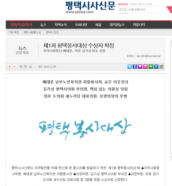 2016년 11월 29일 평택시사신문 - 평택봉사대상(배태분어르신) 페이지 정보 작성일16-12-01 11:18 조회4,453회 댓글0건 관련링크 이전글 다음글 목록 본문 2016년 창간 5주년 평택시사신문 제 1회 평택봉사대상 지역사회봉사부분에 배태분어르신이 수상하셨습니다.다시한번 축하드립니다.자세한 기사내용은 아래 링크를 클릭하세요.http://www.ptsisa.com/news/articleView.html?idxno=16449 댓글목록 등록된 댓글이 없습니다. 이전글 다음글 목록