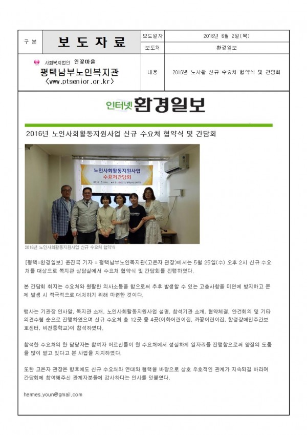 2016년 6월 2일 - 노인사회활동지원사업 신규수요처 협약식 및 간담회 (환경일보 외 1건) 페이지 정보 작성일16-06-03 17:39 조회4,228회 댓글0건 관련링크 이전글 다음글 목록 본문 보다 자세한 내용은 아래 주소를 참고바랍니다.http://www.hkbs.co.kr/?m=bbs&bid=local1&uid=395322http://www.ptlnews.kr/bbs/board.php?&bo_table=news02&wr_id=102754 댓글목록 등록된 댓글이 없습니다. 이전글 다음글 목록