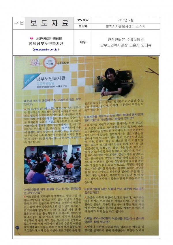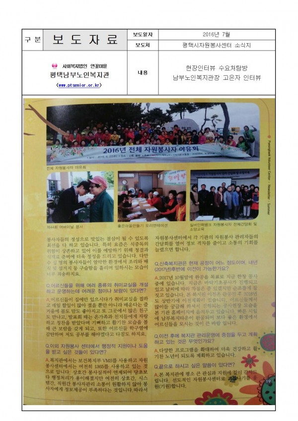 2016년 7월 - 고은자 관장 인터뷰(평택시자원봉사센터 소식지 ) 페이지 정보 작성일16-07-27 15:46 조회3,601회 댓글0건 관련링크 이전글 다음글 목록 본문 보다 자세한 내용은 해당 이미지를 클릭 후 확대하여 봐주시기 바랍니다. 댓글목록 등록된 댓글이 없습니다. 이전글 다음글 목록
