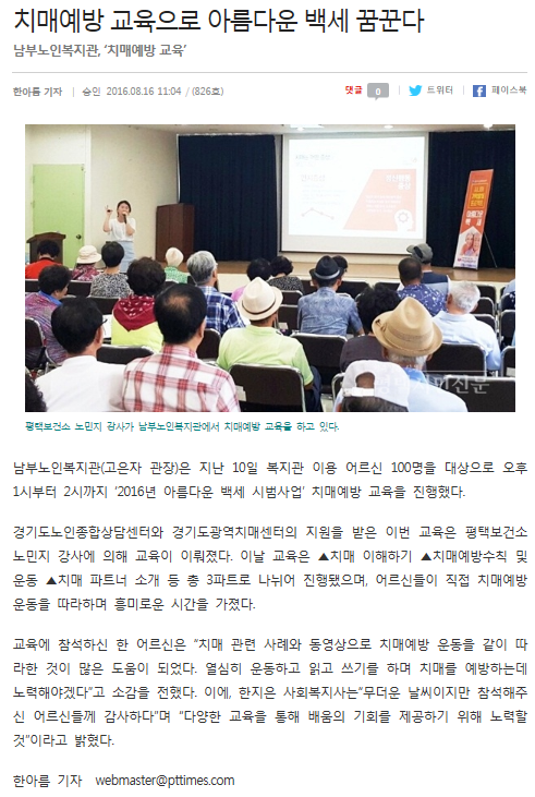 2016년 8월 16일 - <2016년 아름다운 백세 시범사업> 치매예방 교육 (평택시민신문)