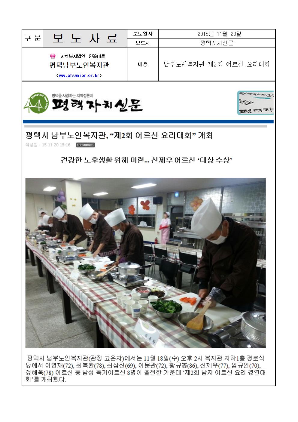 2015년 11월 20일-제2회 어르신 요리대회 개최(평택자치신문) 페이지 정보 작성일15-12-08 14:11 조회4,166회 댓글0건 관련링크 이전글 다음글 목록 본문 보다 자세한 내용은 아래 주소를 참고바랍니다.http://www.ptlnews.kr/bbs/board.php?bo_table=news02&wr_id=102348 댓글목록 등록된 댓글이 없습니다. 이전글 다음글 목록