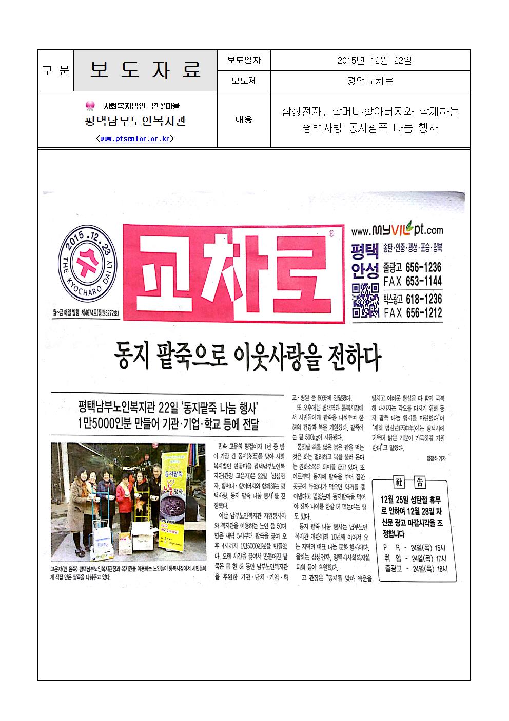 2015년 12월 22일 - 동지팥죽나눔행사(교차로) 페이지 정보 작성일15-12-26 12:41 조회4,098회 댓글0건 관련링크 이전글 다음글 목록 본문 자세한 내용은 아래 주소를 참고 바랍니다.http://news.myvilpt.com/news_view.php?Idx=MzM2Nzk= 댓글목록 등록된 댓글이 없습니다. 이전글 다음글 목록