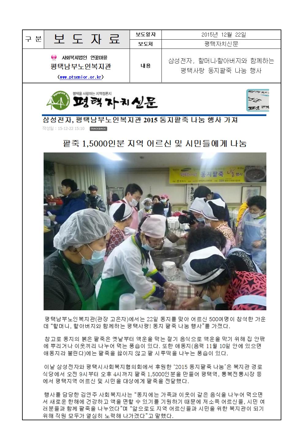 2015년 12월 22일 - 동지팥죽나눔행사(평택자치신문) 페이지 정보 작성일15-12-26 12:42 조회4,134회 댓글0건 관련링크 이전글 다음글 목록 본문 자세한 내용은 아래 주소를 참고바랍니다.http://www.ptlnews.kr/bbs/board.php?bo_table=news02&wr_id=102417 댓글목록 등록된 댓글이 없습니다. 이전글 다음글 목록