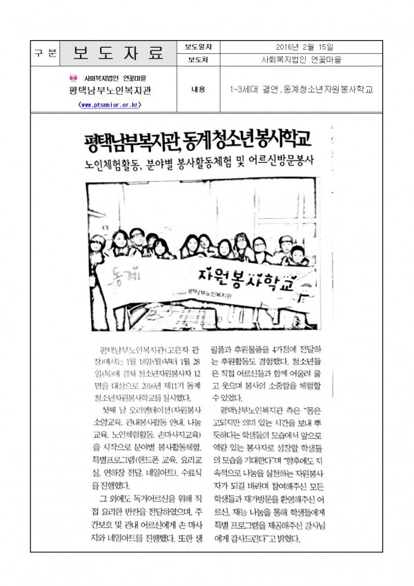 2016년 2월 15일 - 동계청소년자원봉사학교(연꽃마을 보도) 페이지 정보 작성일16-02-17 17:26 조회4,132회 댓글0건 관련링크 이전글 다음글 목록 본문 이미지를 확대하면 더 자세히 보실 수 있습니다.자세한 내용은 아래 주소를 참고바랍니다.http://www.lotusvill.org/연꽃마을신문(2월호) 댓글목록 등록된 댓글이 없습니다. 이전글 다음글 목록