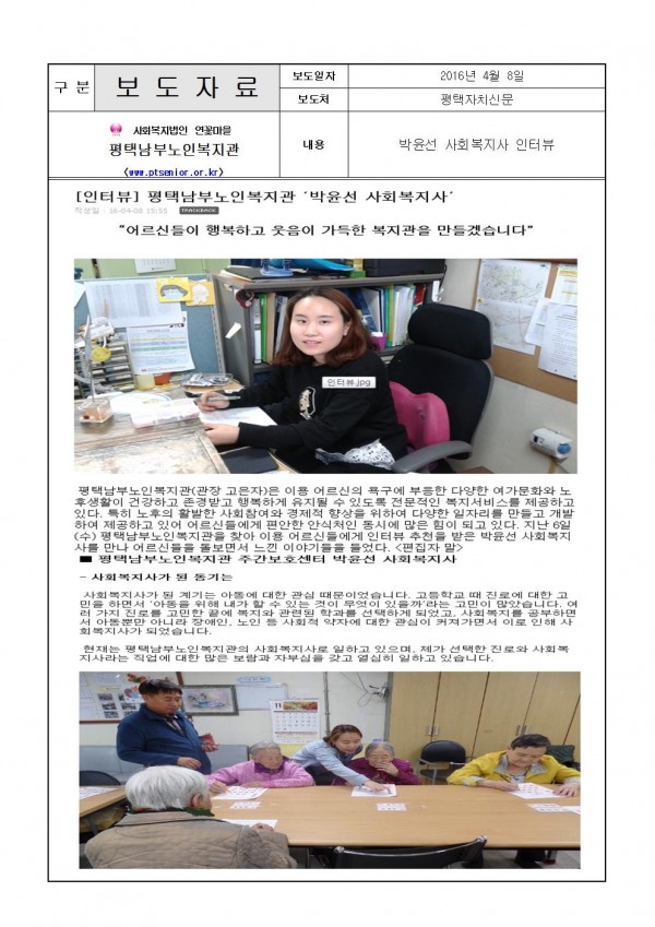 2016년 4월 8일 - 박윤선 사회복지사 인터뷰(평택자치신문) 페이지 정보 작성일16-04-21 14:09 조회3,626회 댓글0건 관련링크 이전글 다음글 목록 본문 . 댓글목록 등록된 댓글이 없습니다. 이전글 다음글 목록