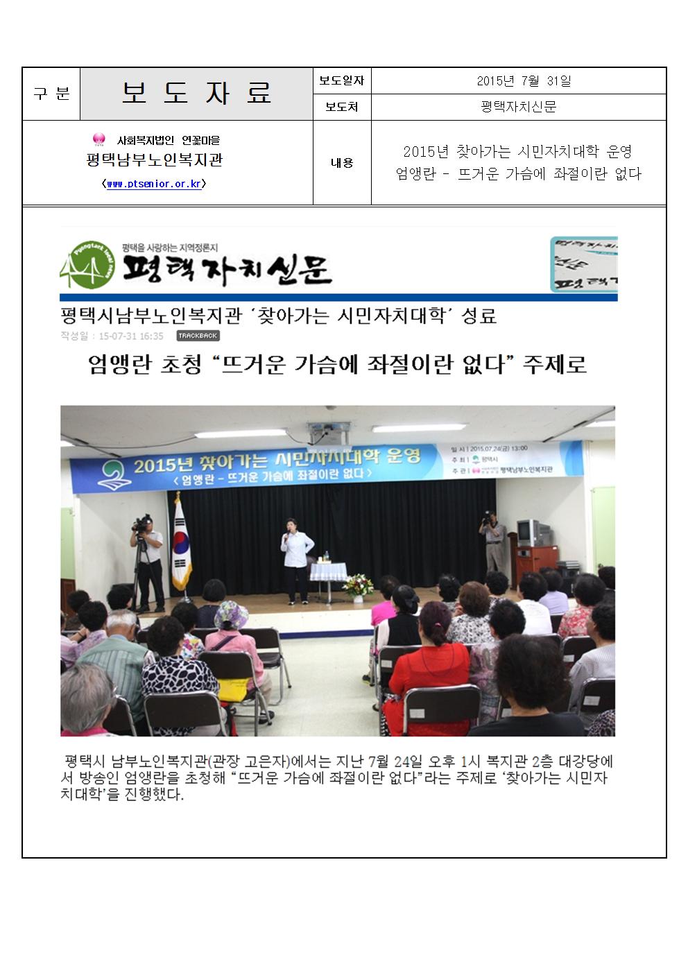 2015년 7월 31일 - 찾아가는 시민자치대학 (방송인 엄앵란) 페이지 정보 작성일15-08-04 14:40 조회4,166회 댓글0건 관련링크 이전글 다음글 목록 본문 자세한 내용은 아래 주소를 참고하시기 바랍니다.http://www.ptlnews.kr/bbs/board.php?bo_table=news01&wr_id=102090 댓글목록 등록된 댓글이 없습니다. 이전글 다음글 목록