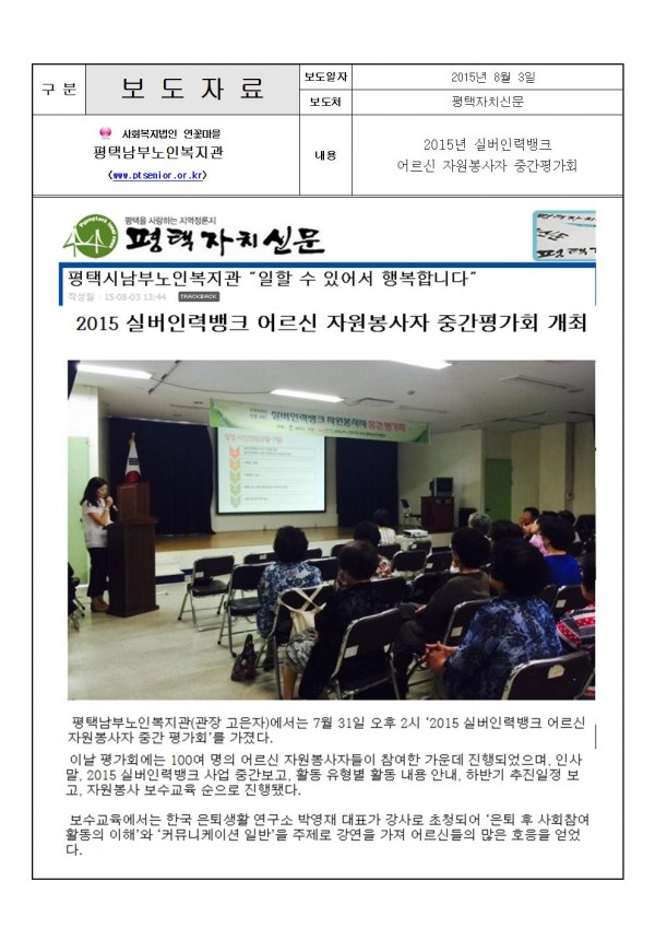 2015년 8월 3일 - 실버인력뱅크 중간평가회 개최 페이지 정보 작성일15-08-07 17:41 조회4,217회 댓글0건 관련링크 이전글 다음글 목록 본문 자세한 내용은 아래 주소를 참고바랍니다.http://www.ptlnews.kr/bbs/board.php?bo_table=news02&wr_id=102095 댓글목록 등록된 댓글이 없습니다. 이전글 다음글 목록
