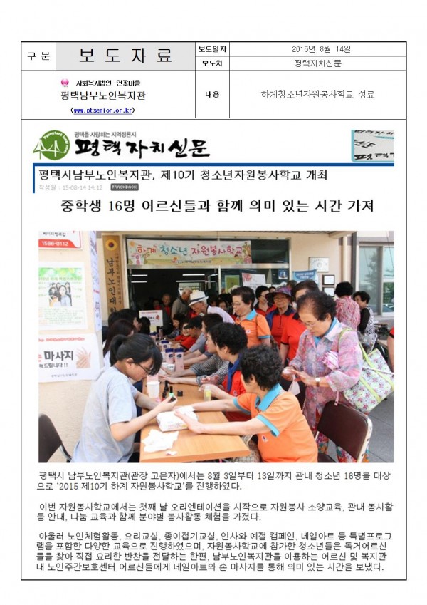 2015년 8월 14일 - 제 10기 청소년자원봉사학교 개최 페이지 정보 작성일15-08-20 17:15 조회4,099회 댓글0건 관련링크 이전글 다음글 목록 본문 자세한 내용은 아래 내용 참고바랍니다.http://www.ptlnews.kr/bbs/board.php?bo_table=news01&wr_id=102136 댓글목록 등록된 댓글이 없습니다. 이전글 다음글 목록