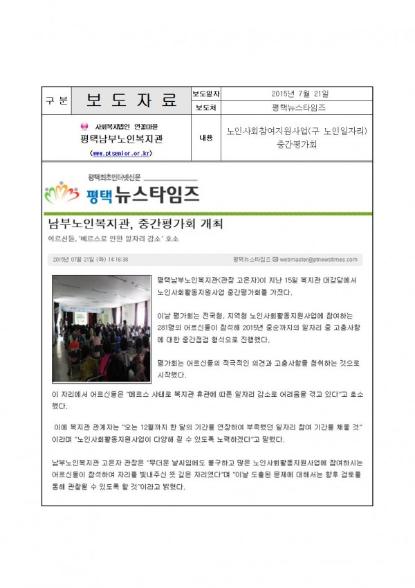 2015년 7월 21일 - 노인사회참여지원사업(구 노인일자리) 중간평가회 페이지 정보 작성일15-10-08 17:38 조회3,996회 댓글0건 관련링크 이전글 다음글 목록 본문 자세한 내용은 아래 주소를 참고바랍니다.http://www.ptnewstimes.com/news/articleView.html?idxno=4976 댓글목록 등록된 댓글이 없습니다. 이전글 다음글 목록