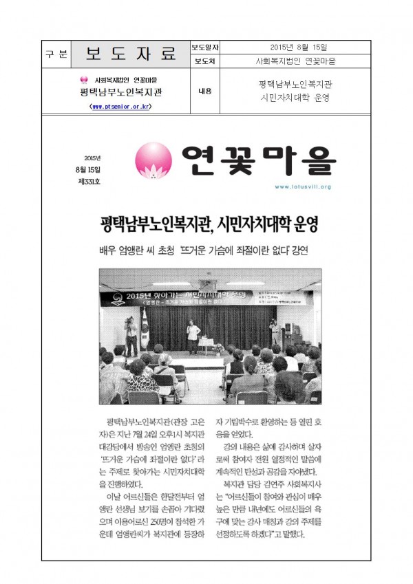 2015년 8월 15일 - 평택남부노인복지관 시민자치대학 운영(연꽃마을신문) 페이지 정보 작성일15-10-08 17:43 조회3,982회 댓글0건 관련링크 이전글 다음글 목록 본문 자세한 내용은 아래 주소를 참고바랍니다.http://www.lotusvill.org/ 댓글목록 등록된 댓글이 없습니다. 이전글 다음글 목록