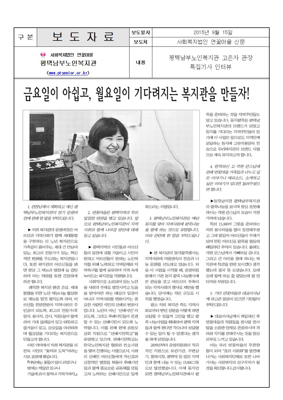 2015년 9월 15일 - 평택남부노인복지관 고은자 관장 특집 인터뷰(연꽃마을신문) 페이지 정보 작성일15-11-19 18:01 조회3,563회 댓글0건 관련링크 이전글 다음글 목록 본문 이미지를 더블클릭하면 확대하여 편히 보실 수 있습니다. 댓글목록 등록된 댓글이 없습니다. 이전글 다음글 목록