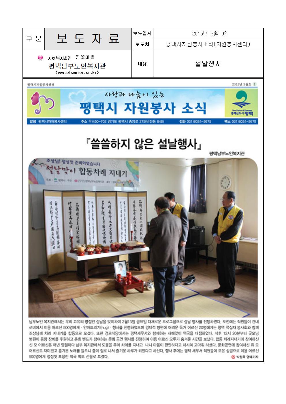 2015년 3월 9일 - 2015년 설날행사 자원봉사센터소식지 보도 페이지 정보 작성일15-03-16 10:39 조회3,979회 댓글0건 관련링크 이전글 다음글 목록 본문 자세한 내용은 아래 주소 참고바랍니다.http://www.pt1365.go.kr/vol/gov/mogaha/ntis/web/vol/vcm/action/VolVcmBbsPortalAction.do 댓글목록 등록된 댓글이 없습니다. 이전글 다음글 목록