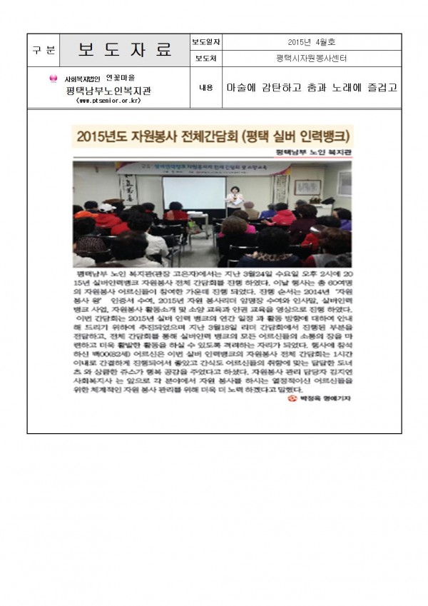 2015년 4월 - 2015년도 자원봉사 전체 간담회(실뱅) 페이지 정보 작성일15-05-14 14:30 조회3,851회 댓글0건 관련링크 이전글 다음글 목록 본문 자세한 내용은 아래 주소 참고바랍니다.http://www.pt1365.go.kr/vol/gov/mogaha/ntis/web/vol/vcm/action/VolVcmBbsPortalAction.do 댓글목록 등록된 댓글이 없습니다. 이전글 다음글 목록