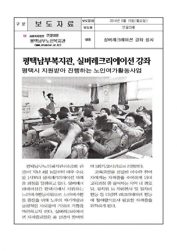 2014년 5월 15일 -실버레크레이션자격증 과정 (연꽃마을) 페이지 정보 작성일14-07-10 14:33 조회3,269회 댓글0건 관련링크 이전글 다음글 목록 본문 . 댓글목록 등록된 댓글이 없습니다. 이전글 다음글 목록