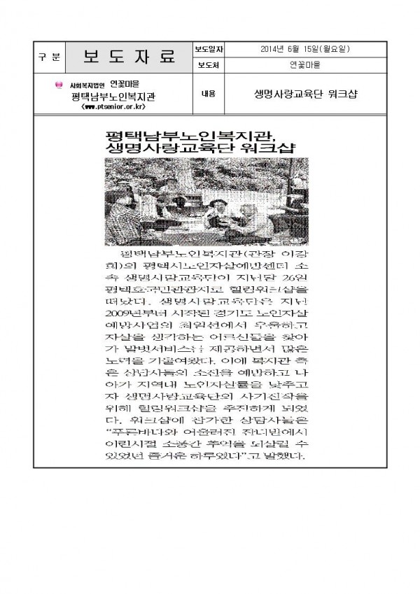 2014년 6월 15일 - 생명사랑교육단 워크샵 실시 (연꽃마을) 페이지 정보 작성일14-07-10 14:40 조회3,305회 댓글0건 관련링크 이전글 다음글 목록 본문 . 댓글목록 등록된 댓글이 없습니다. 이전글 다음글 목록