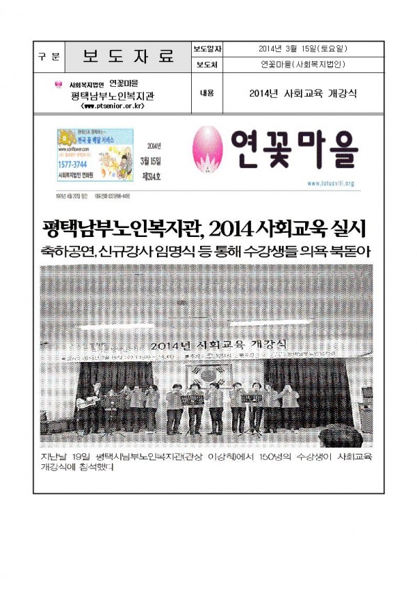 2014년 3월15일 사회교육개강식 보도자료(연꽃마을) 페이지 정보 작성일14-03-31 13:56 조회3,270회 댓글0건 관련링크 이전글 다음글 목록 본문 . 댓글목록 등록된 댓글이 없습니다. 이전글 다음글 목록