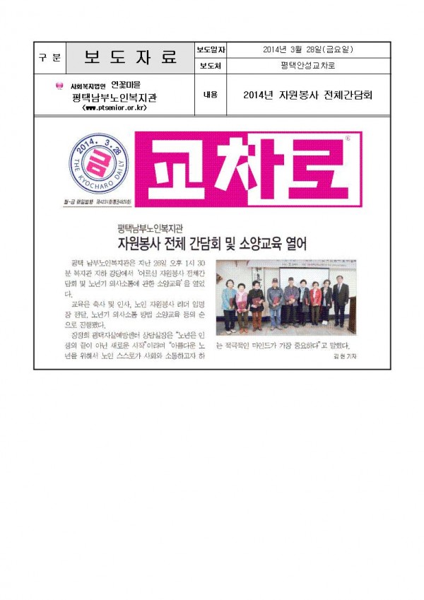2014년 3월28일 어르신자원봉사 전체간담회 및 소양교육 보도자료(평택/안성교차로) 페이지 정보 작성일14-03-31 13:58 조회3,292회 댓글0건 관련링크 이전글 다음글 목록 본문 . 댓글목록 등록된 댓글이 없습니다. 이전글 다음글 목록