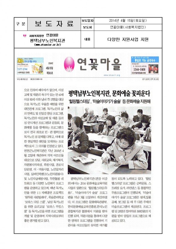 2014년 4월 15일 -다양한 문화예술지원사업 진행-(연꽃마을) 페이지 정보 작성일14-05-12 14:59 조회3,261회 댓글0건 관련링크 이전글 다음글 목록 본문 . 댓글목록 등록된 댓글이 없습니다. 이전글 다음글 목록