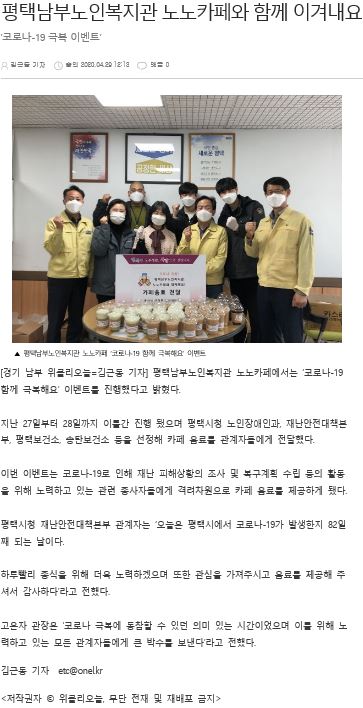 (노노카페 )평택남부노인복지관 노노카페와 함께 이겨내요(위클리 오늘) 페이지 정보 작성일20-04-29 16:39 조회1,733회 댓글0건 관련링크 http://www.weeklytoday.com/news/articleView.html?idxno=175103 1567회 연결 이전글 다음글 목록 본문 http://www.weeklytoday.com/news/articleView.html?idxno=175103 댓글목록 등록된 댓글이 없습니다. 이전글 다음글 목록