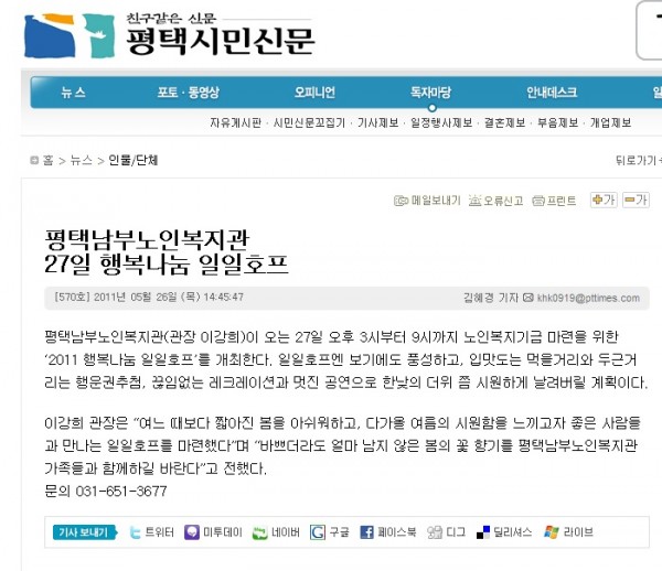 2011년 5월 26일 평택시민신문 "평택남부노인 복지관 27일 일일호프" 페이지 정보 작성일11-06-07 13:18 조회3,167회 댓글0건 관련링크 이전글 다음글 목록 본문 2011년 5월 26일 평택시민신문 댓글목록 등록된 댓글이 없습니다. 이전글 다음글 목록