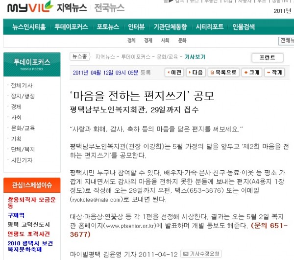 2011년 4월 12일자 마이빌평택 "마음을 전하는 편지 쓰기 공모" 페이지 정보 작성일11-06-07 13:25 조회3,358회 댓글0건 관련링크 이전글 다음글 목록 본문 2011년 4월 12일 마이빌 평택 댓글목록 등록된 댓글이 없습니다. 이전글 다음글 목록
