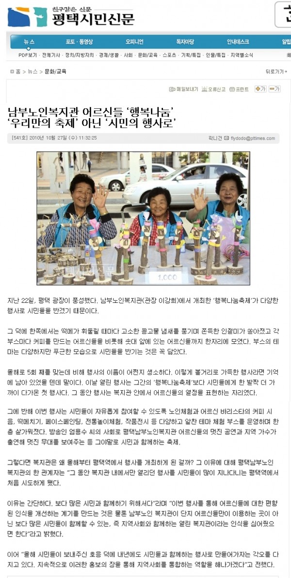 2010년 10월 27일자 평택시민신문 "남부노인복지관 어르신들 ‘행복나눔’ ‘우리만의 축제’ 아닌 ‘시민의 행사로’… 페이지 정보 작성일11-05-16 15:33 조회3,143회 댓글0건 관련링크 이전글 다음글 목록 본문 2010년 10월 27일자 평택시민신문 기사 스크랩 댓글목록 등록된 댓글이 없습니다. 이전글 다음글 목록