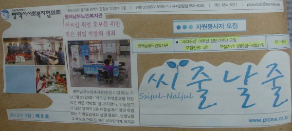 2010년 8월 제8호 평택시 사회복지협의회 "씨줄날줄" 페이지 정보 작성일10-09-20 12:30 조회3,268회 댓글0건 관련링크 이전글 다음글 목록 본문 1 댓글목록 등록된 댓글이 없습니다. 이전글 다음글 목록