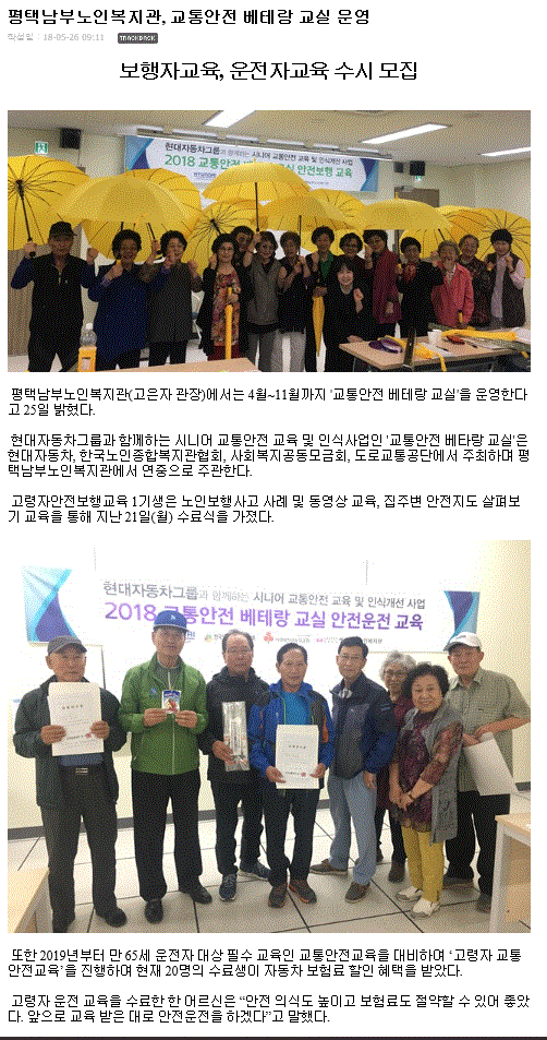 2018.5.16.평택남부노인복지관 교통안전 베테랑 운전자, 보행자 교육 진행 페이지 정보 작성일18-07-06 10:09 조회3,001회 댓글0건 관련링크 http://www.ptlnews.kr/bbs/board.php?bo_table=zone&wr_id=103107 2040회 연결 이전글 다음글 목록 본문 . 댓글목록 등록된 댓글이 없습니다. 이전글 다음글 목록