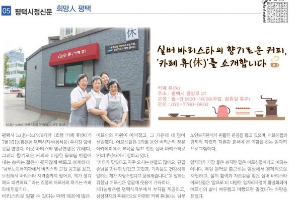 2017.9월호 카페"휴" 인터뷰(평택 시정 신문) 페이지 정보 작성일17-09-20 10:32 조회3,122회 댓글0건 관련링크 이전글 다음글 목록 본문 카페 "휴" 많은 이용부탁드립니다. 댓글목록 등록된 댓글이 없습니다. 이전글 다음글 목록