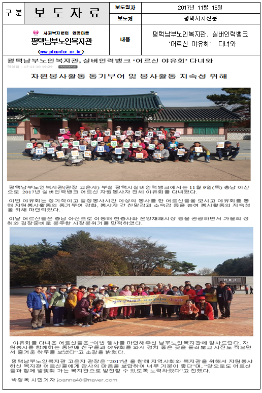 2017.11.15-실버인력뱅크 자원봉사자 야유회(평택자치신문) 페이지 정보 작성일17-11-15 09:52 조회4,177회 댓글0건 관련링크 이전글 다음글 목록 본문 자세한 기사내용은 아래링크를 확인하세요http://www.ptlnews.kr/bbs/board.php?bo_table=zone&wr_id=102818 댓글목록 등록된 댓글이 없습니다. 이전글 다음글 목록